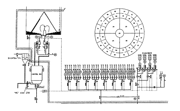 CP生料均化庫是南通江森機(jī)械制造有限公司引進(jìn)德國BMH公司一種新型生料均化庫,其特點是電耗低,均化效果好。CP生料均化庫的均化原理是庫頂生料通過8條斜槽均勻布料,不同時期的生料在庫內(nèi)呈橫向分布,庫底充氣系統(tǒng)設(shè)計更符合生料充氣后的流動性,呈放射狀斜向分布,環(huán)形區(qū)一般分8個區(qū),每隔5分鐘輪流充氣,充氣區(qū)生料因松動及氣流的引導(dǎo)卸入中心區(qū),庫內(nèi)不同層的生料豎向切割下料實現(xiàn)生料的均化,不同時間的生料進(jìn)入中心區(qū)后再進(jìn)行氣體強(qiáng)烈混合均化,從而達(dá)到理想的均化效果。