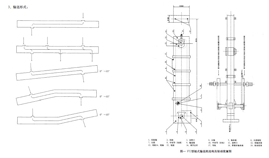 (6)FU型鏈?zhǔn)捷斔蜋C(jī)進(jìn)出口靈活,高架、地面、地坑、水平、爬坡(≤15°)均可安裝,輸送長(zhǎng)度可根據(jù)用戶設(shè)計(jì)。